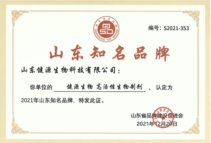 熱烈祝賀山東健源生物“健源生物高活性生物制劑”被認定為山東知名品牌