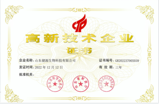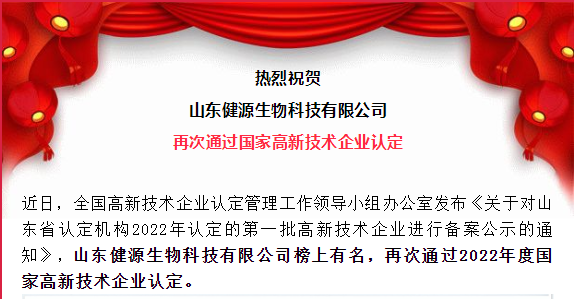 祝賀山東健源生物再次通過國家高新技術企業認定