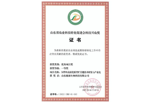 山東健源生物榮獲山東省農業科技轉化促進會科技興農獎一等獎