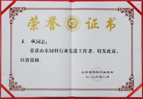 山東健源生物董事長王誠榮獲2023山東飼料行業先進工作者
