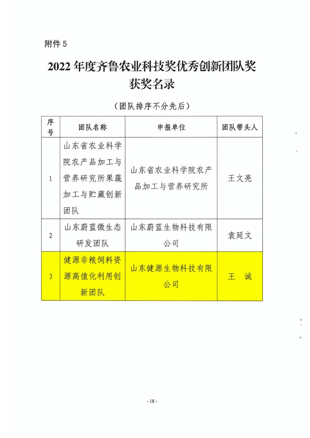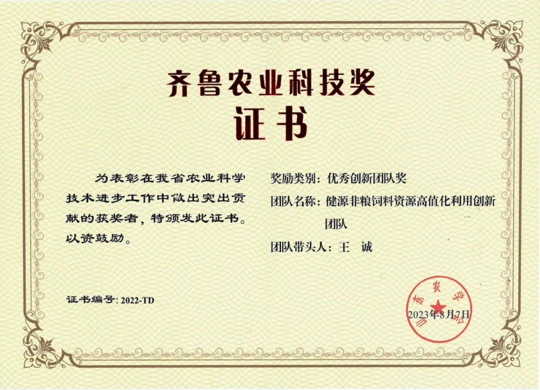 由山東健源生物有限公司董事長王誠作為團(tuán)隊(duì)帶頭人,帶隊(duì)的“健源非糧飼料資源高值化利用創(chuàng)新團(tuán)隊(duì)”榮獲2022年度齊魯農(nóng)業(yè)科技獎優(yōu)秀創(chuàng)新團(tuán)隊(duì)獎。