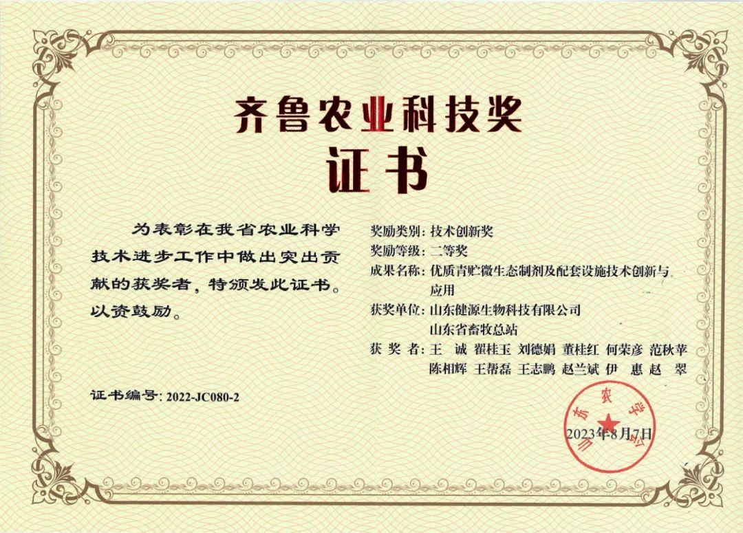 山東健源生物科技有限公司作為第一完成單位申報(bào)的“優(yōu)質(zhì)青貯微生態(tài)制劑及配套設(shè)施技術(shù)創(chuàng)新與應(yīng)用”項(xiàng)目榮獲2022年度齊魯農(nóng)業(yè)科技獎技術(shù)創(chuàng)新獎二等獎。