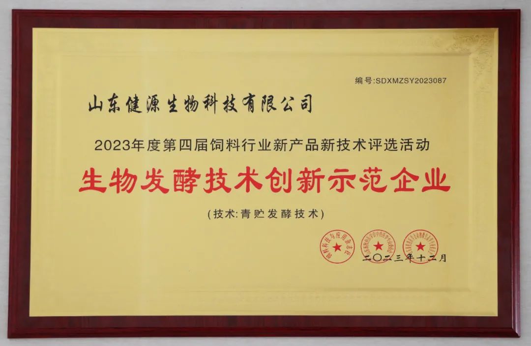 12月12日,由山東畜牧醫學會主辦的第四屆青鳥論壇暨2023年度飼料行業新產品新技術研討發布會在濟南舉行。山東健源生物科技有限公司獲評生物發酵技術創新示范企業。