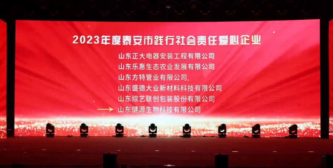 12月29日,2023迎新年銀企聯誼會暨2023年泰山企業家、泰安市“誠信工作先進企業”、 泰安市踐行社會責任愛心企業頒獎盛典隆重舉行。大會總結交流全市推進新型工業化和企業創新發展的成就與經驗,表彰先進。山東健源生物科技有限公司榮獲“泰安市企業文化優秀成果一等獎”、“泰安市誠信工作先進企業”、“泰安市踐行社會責任愛心企業”榮譽稱號。