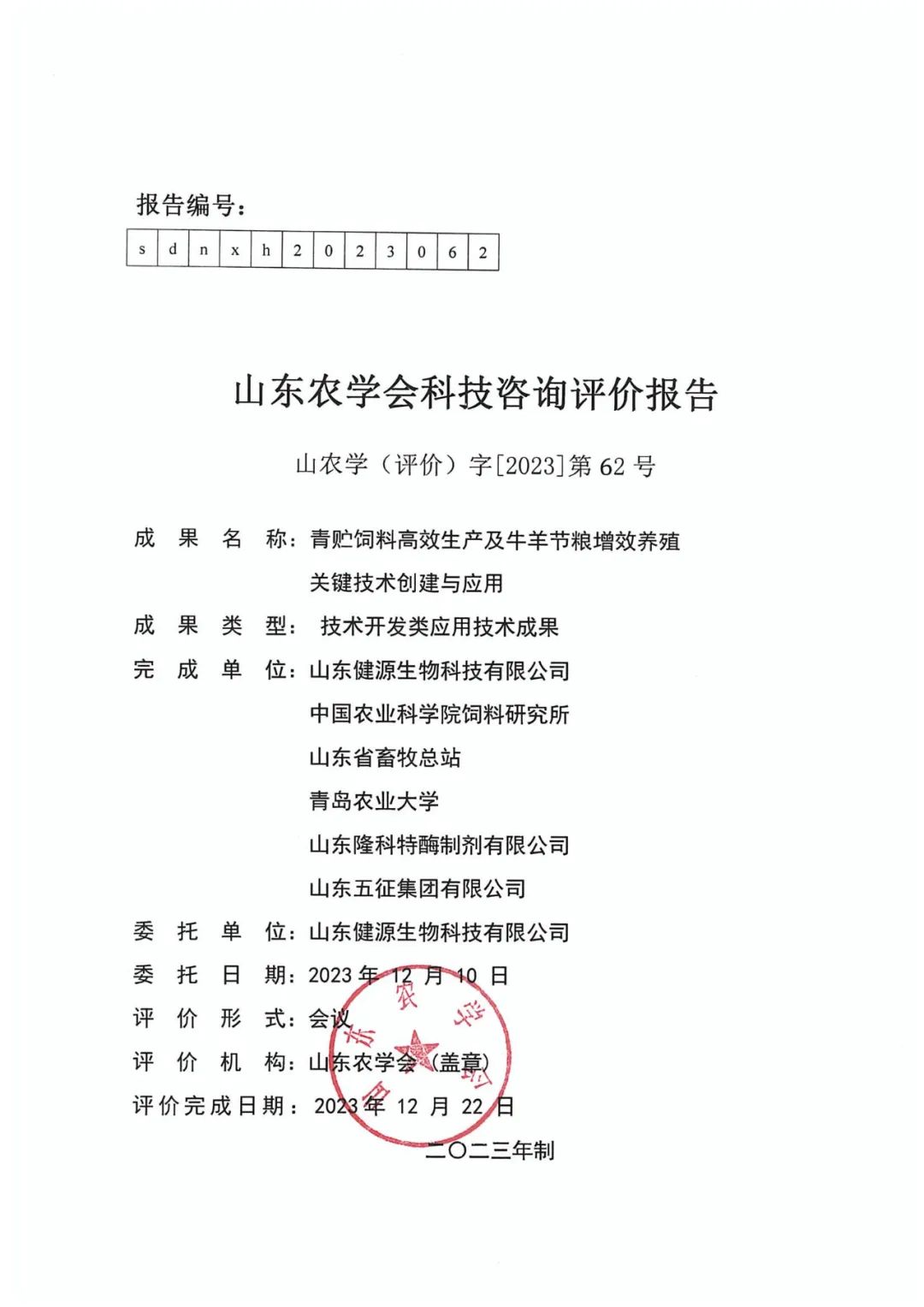 2023年12月22日,由山東健源生物科技有限公司聯合中國農業科學院飼料研究所、山東省畜牧總站、青島農業大學、山東五征集團有限公司、山東隆科特酶制劑有限公司完成的“飼草料高效生產及節糧增效養殖關鍵技術創建與應用”項目順利通過了科技成果評價。