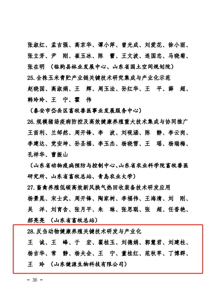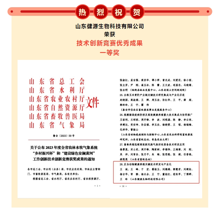 近日,山東省總工會、省水利廳、省農業農村廳、省自然資源廳、省畜牧獸醫局、省氣象局發布了2023年度全省農林水牧氣象系統“鄉村振興杯”和“建設綠色安瀾黃河”工作創新技術創新競賽獲獎成果,山東健源生物科技有限公司的《反芻動物健康養殖關鍵技術研發與產業化》項目榮獲技術創新競賽優秀成果一等獎。