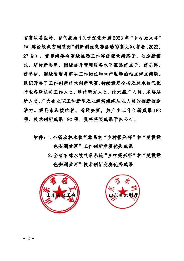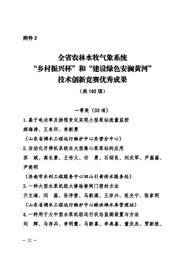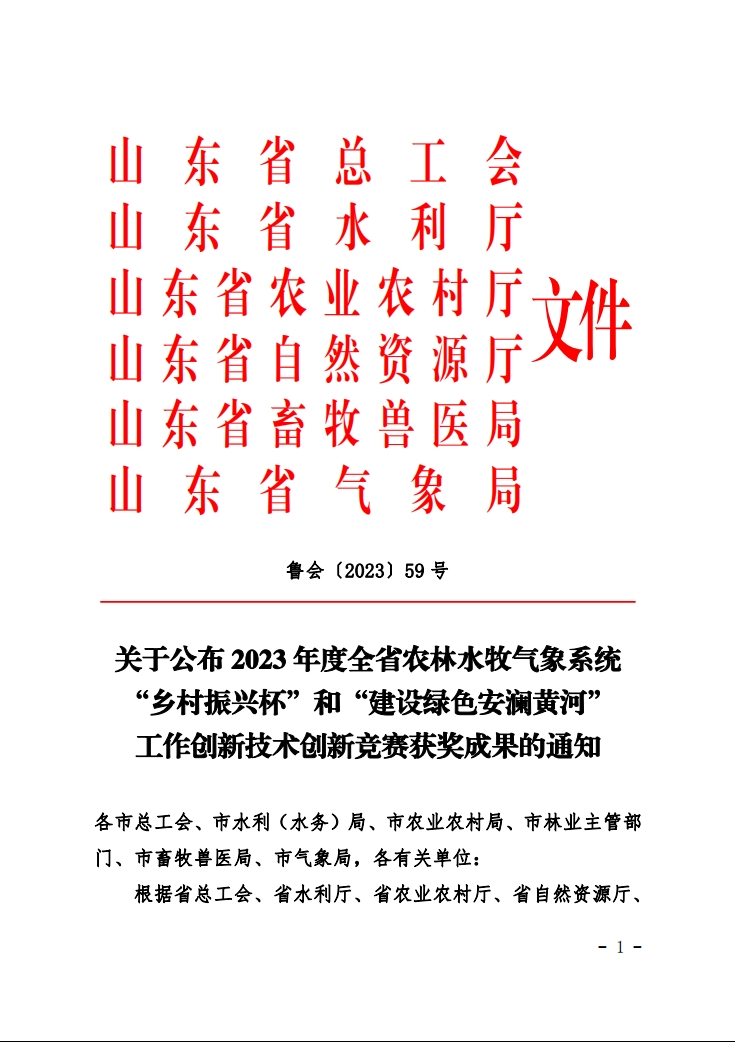 本次競賽活動是根據《關于深化開展2023年“鄉村振興杯”和“建設綠色安瀾黃河”創新創優競賽活動的意見》(魯會【2023】27號),競賽組委會圍繞推動工作突破探索新路子、創造新模式、培樹新典型,圍繞提升管理服務水平征集好點子、好思路、好舉措,圍繞發現并解決工作崗位和生產現場的難點堵點問題,組織開展了工作創新技術創新競賽,經縣市選拔推薦、省級決賽,競賽組委會嚴格規范評選,共產生技術創新成果192項,其中,一等獎33項。