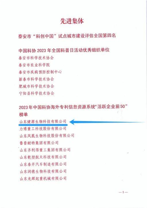 健源生物入選2023年中國科協(xié)海外專利信息資源系統(tǒng)“活躍企業(yè)前50”榜單