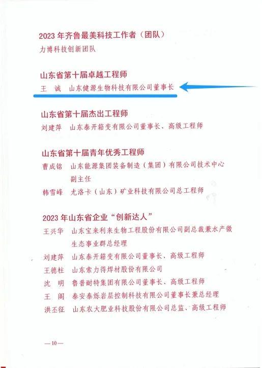 董事長王誠榮獲山東省第十屆卓越工程師