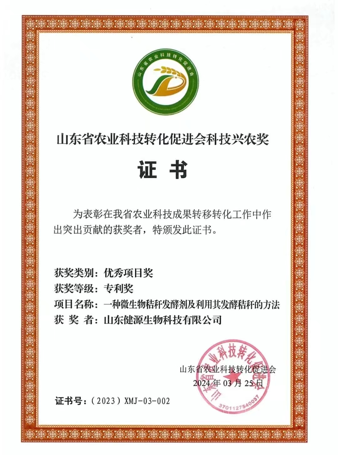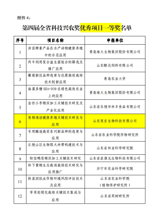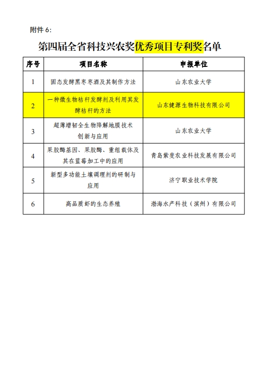 山東健源生物科技有限公司申報的《一種微生物秸稈發酵劑及其發酵秸稈的方法》項目獲得山東省農業科技轉化促進會科技興農獎優秀項目獎專利獎。健源生物旗下子公司山東寵言生物科技有限公司申報的《寵物清潔健康養殖關鍵技術研發與應用》項目獲得山東省農業科技促進會科技興農獎優秀項目獎一等獎,董事長王誠為兩個項目的第一完成人。
