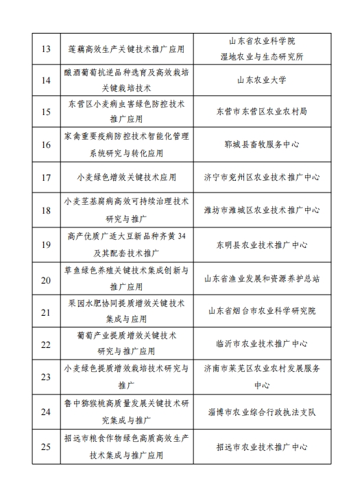 根據《山東省農業科技轉化促進會科技興農獎獎勵章程》的有關規定,經過評審委員會評審、獎勵委員會審定,評審出了第四屆全省科技興農獎先進集體10個、先進個人20人、優秀項目特等獎2項、優秀項目一等獎36項,優秀項目二等獎56項、優秀項目專利獎6項。