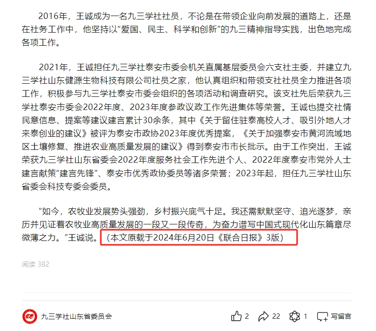 日前,王誠董事長接受了聯合日報記者的采訪,報道發表在2024年6月20日《聯合日報》3版,講述了王誠董事長作為“新農人”,20多年來深耕微生態領域,以高活性益生菌符合生物制劑技術為基點,從飼草料高效青貯、動物全消化道功能調控、養殖環境污染控制等方面開展全方位的發明創新,用專有發明技術助力農牧業高質量發展。而作為一名九三學社社員,王誠董事長堅持以“愛國、民主、科學和創新”的九三精神指導實踐,出色地完成各項工作。該報道同時被九三學社山東省委員會轉載報道。