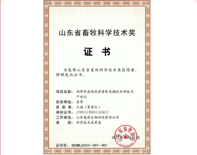 2022-8-17 【喜報】山東健源生物榮獲山東省畜牧科學技術獎一等獎