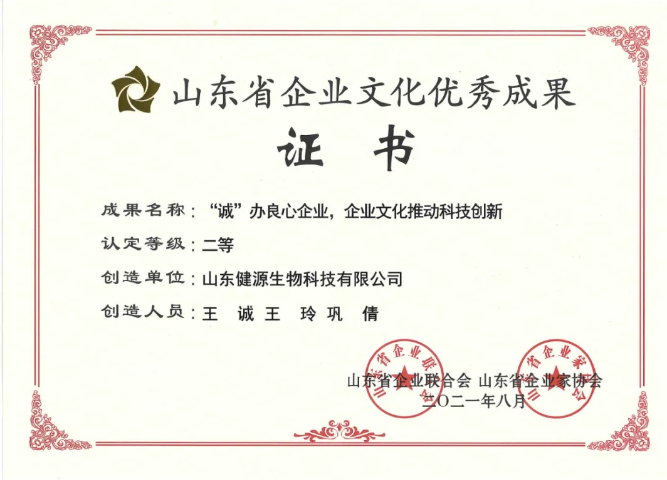 2021-12-20 熱烈祝賀山東健源生物科技有限公司榮獲首屆山東省企業文化優秀成果二等獎