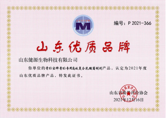 2022-1-4 祝賀山東健源生物“青貯寶牌青貯專用復合乳酸菌制劑產品”被認定為2021年度山東優質品牌產品