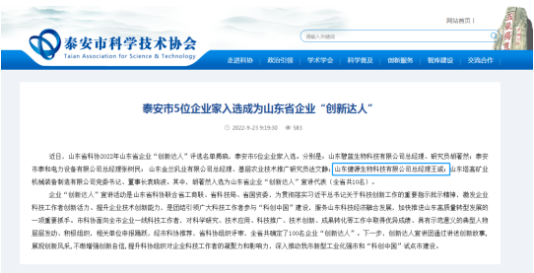 山東健源生物董事長王誠榮獲2022山東省企業(yè)“創(chuàng)新達(dá)人”稱號(hào)
