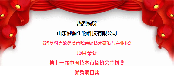 近日,“構建新發展格局,建設中國式現代化高層報告會暨第十一屆中國技術市場協會金橋獎表彰獎勵大會”在北京隆重召開,經專家評審委員會評審,山東健源生物科技有限公司《飼草料高效優質青貯關鍵技術研發與產業化》項目榮獲第十一屆中國技術市場協會金橋獎優秀項目獎。