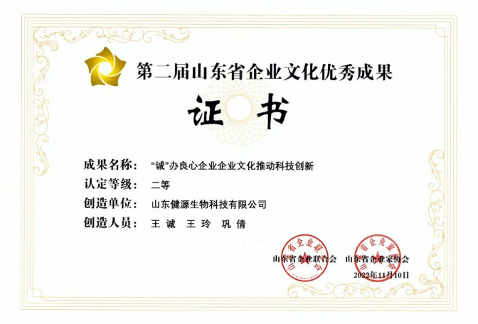 山東省企業聯合會、山東省企業家協會聯合開展了第二屆山東省企業文化優秀成果發布活動。通過企業申報,各市企業聯合會、企業家協會和有關部門(單位)推薦,依據《山東省企業文化成果認定規范》團體標準,按照公開、公正的原則,堅持嚴謹、科學、規范的程序,經初審、發布會現場發布、專家評審,有79項成果被確定為山東省企業文化優秀成果,山東健源生物科技有限公司《“誠”辦良心企業,企業文化推動科技創新》企業文化成果榮獲第二屆山東省企業文化優秀成果二等獎。