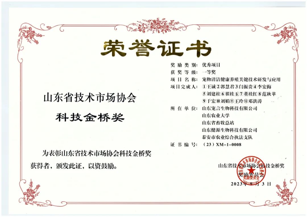 9月14日,2023年度山東省科技金橋獎表彰獎勵大會暨科技引領(lǐng)高質(zhì)量發(fā)展會議在濟寧任城區(qū)召開。山東健源生物有限公司與其下屬山東寵言生物科技有限公司共同完成的“寵物清潔健康養(yǎng)殖關(guān)鍵技術(shù)研發(fā)與應用”項目,經(jīng)過專業(yè)組評審、評審委員會評審、獎勵委員會終審,最終榮獲山東省技術(shù)市場協(xié)會科技金橋獎優(yōu)秀項目一等獎。